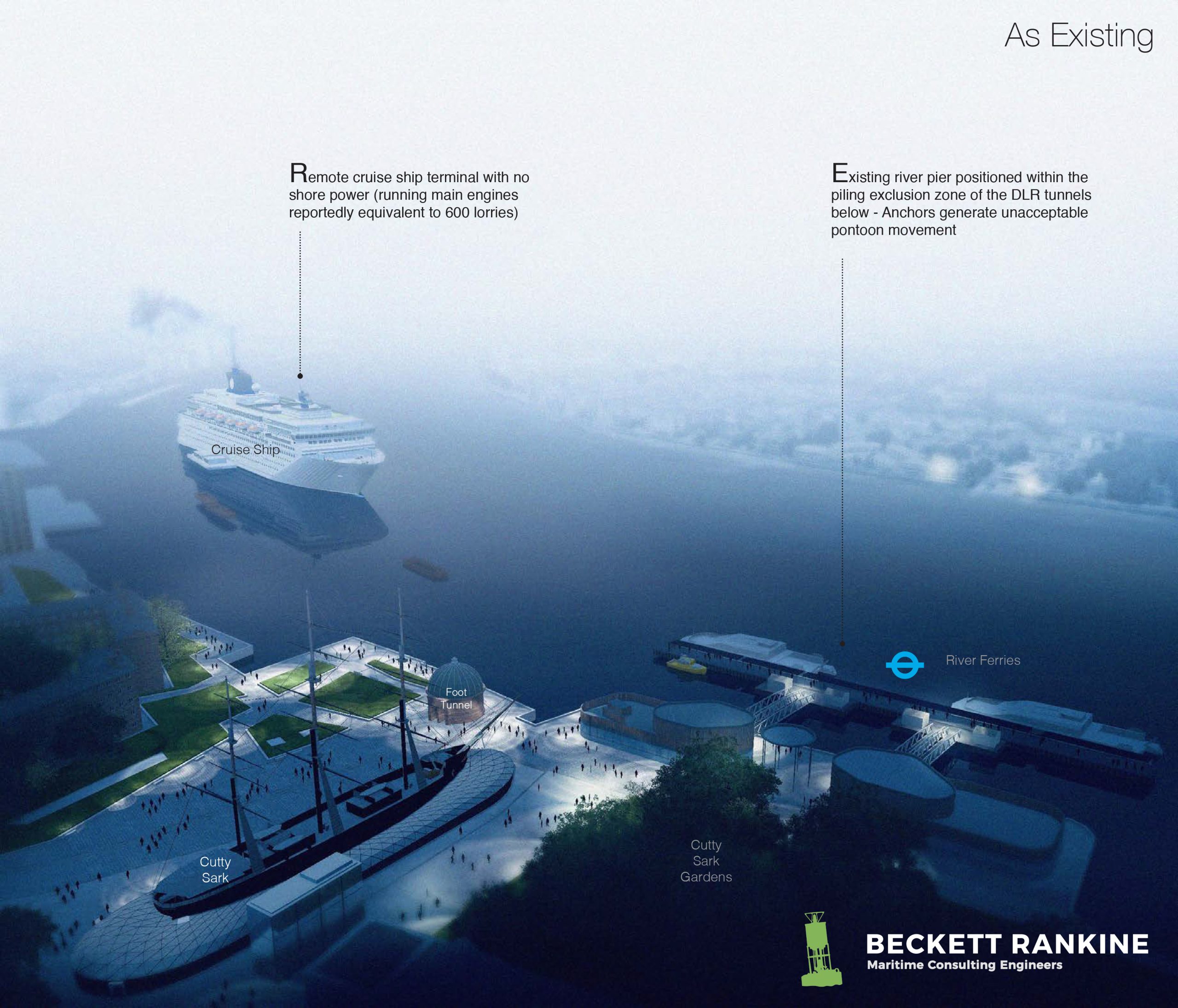 The central idea of the proposal is to redevelop the Greenwich passenger pier into a new river-bus and cruise ship terminal, improving accessibility for passengers from ship to shore and reducing cruise ship emissions in berth with shoreside power connectivity.