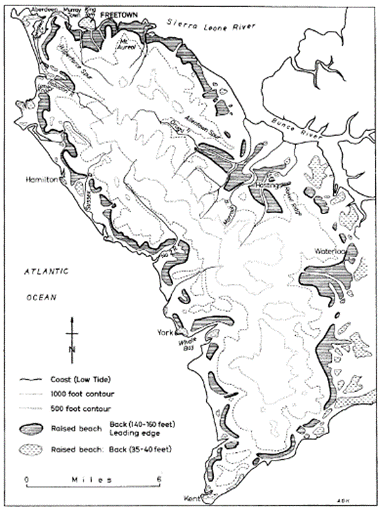 The coastal areas of the peninsula are defined by a series of raised beaches (see Figure 7) that are formed of unconsolidated clayey sand and silts that have previously been classified as part of the Bullom series [3]. The Bullom Group is the youngest stratigraphic group in Sierra Leone and comprises poorly consolidated Cenozoic sediments [2]. There have been very few detailed studies of the Bullom Group undertaken, however it is described as a poorly consolidation coarse quartzofelspathic sand. Moreover, the coastal deposits around the Freetown Peninsula are not contemporaneous with the deeper Bullom series and therefore have been cautiously classified as Bullom Group deposits for the Freetown development. The site-specific deposits are distinctly red in colour and weather / solidify into a laterite rock, which was observed as a common earthwork construction material across the Freetown area.