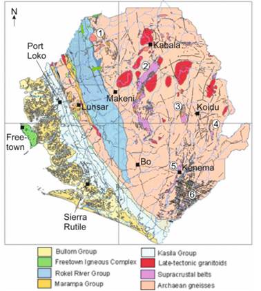 [1] Wells, M.K. (1962), Structure and petrology of the Freetown Layered Basic Complex of Sierra Leone. [2] Macfarlane, A, Crow, M.J., Arthurs, J.W., Wilkinson, A.F. and Aucott, J.W. (1981). The geology and mineral resources of Northern Sierra Leone. Oveseas Memoirs. (Institute of Geological Sciences), No. 7. [3] Goodenough, K.M., Jones, D and Ford, J. (2018) Geological mapping of Sierra Leone: baseline assessment and next steps. [4] Gregory, S. (1962). The raised beaches of the peninsula area of Sierra Leone, Transactions and Papers (Institute of British Geographers), No. 31, pp 15-22.