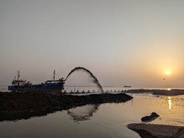 The ground improvement works originally entailed vibro compaction of the hydraulic fill to ensure it was uniformly compacted and to reduce further settlements once the berth is operational. However, considering the ground conditions, the ground improvement design was adapted to include stone columns within the underlying soft clay. These were constructed using the same vibration compactor poker, with the stone only placed over the clay column height. Further CPTs were undertaken after the reclamation and ahead of the ground improvement works to allow an accurate profiling of the hydraulic fill and clay layers, so that the work could be optimised for the relevant vibro compaction and stone column vertical extents and transitions. The stone columns were placed on a regular grid across the cofferdam box to enable faster consolidation of the soft clays under the weight of the hydraulic fill, improve the clay properties through consolidation and enable better load distribution to reinforce the clays. The ground improvement will reduce long-term settlements of the berth throughout operation, future maintenance of the berth pavement surface is anticipated to be within standard requirements for a typical bulk terminal berth.
