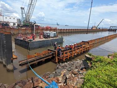From the start of the procurement process, there was additional pressure on the project timeline to start critical activities before Sierra Leone’s rainy season between May and November. When the price of steel rapidly elevated along with significant delivery delays – a likely side effect of the pandemic delaying production and disruption from the Ukraine war – the design had to change to recalibrate, adjusting the steel tube sizes to suit availability while achieving the same result within the same time frame. Then later, further reanalysis and adjustment was required when observations from the site during piling for the new berth showed that some of the ground was softer than had originally been anticipated.