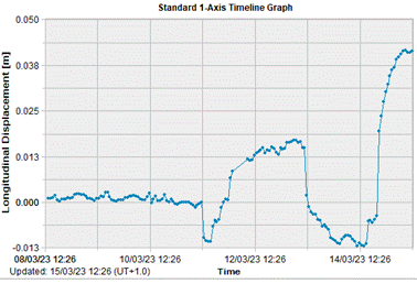 The reclamation works were carried out under a controlled sequence of stages, using an observational method to track displacements against predictions, whilst feeding real-life results back into the Plaxis models. Beckett Rankine provided an on-site geotechnical engineering representative to work collaboratively with the dredging contractor and main Contractor to adapt the sequence against the monitoring results and design calculations. The dredger was a Trailing Suction Hopper Dredger (TSHD) with relatively small hopper capacity up to a maximum of 1,000m3, although most loads were between 700-800m3. Each load was delivered within an approximate 3 to 4 hour window, allowing live multiple monitoring data readings to be reviewed to understand the behaviour of the box ahead of each load, see Figure 10. The monitoring data indicated that the filling had an almost immediate effect on the cofferdam walls, giving an indication of the sand quantities within the shallow soft clay layer increasing the permeability of the ground.