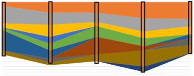When the piling commenced in June 2022, it became quickly evident that ground conditions were more complex than previously assumed. The piles were penetrating to a depth under self-weight or with less vibrations or driving force than was initially anticipated. Based on this, a series of offshore CPTs were procured using a ground investigation contractor from the neighbouring country, Guinea. Despite the complex properties of the clay presenting challenges for the CPT campaign, the successful CPTs were able to validate the highly variable nature of the ground across the berth, with the layers of clay and sand less defined than previously understood from the onshore boreholes and geophysics, see Figure 8 (showing very soft and soft clays in grey/yellow with variable density sands from very loose to moderately dense indicated by the blue, green and dark orange tones, ultimately underlain by a dense sand in dark yellow and stiff clay at depth). The CPTs also indicated that the softer material extended to greater depths than originally indicated.